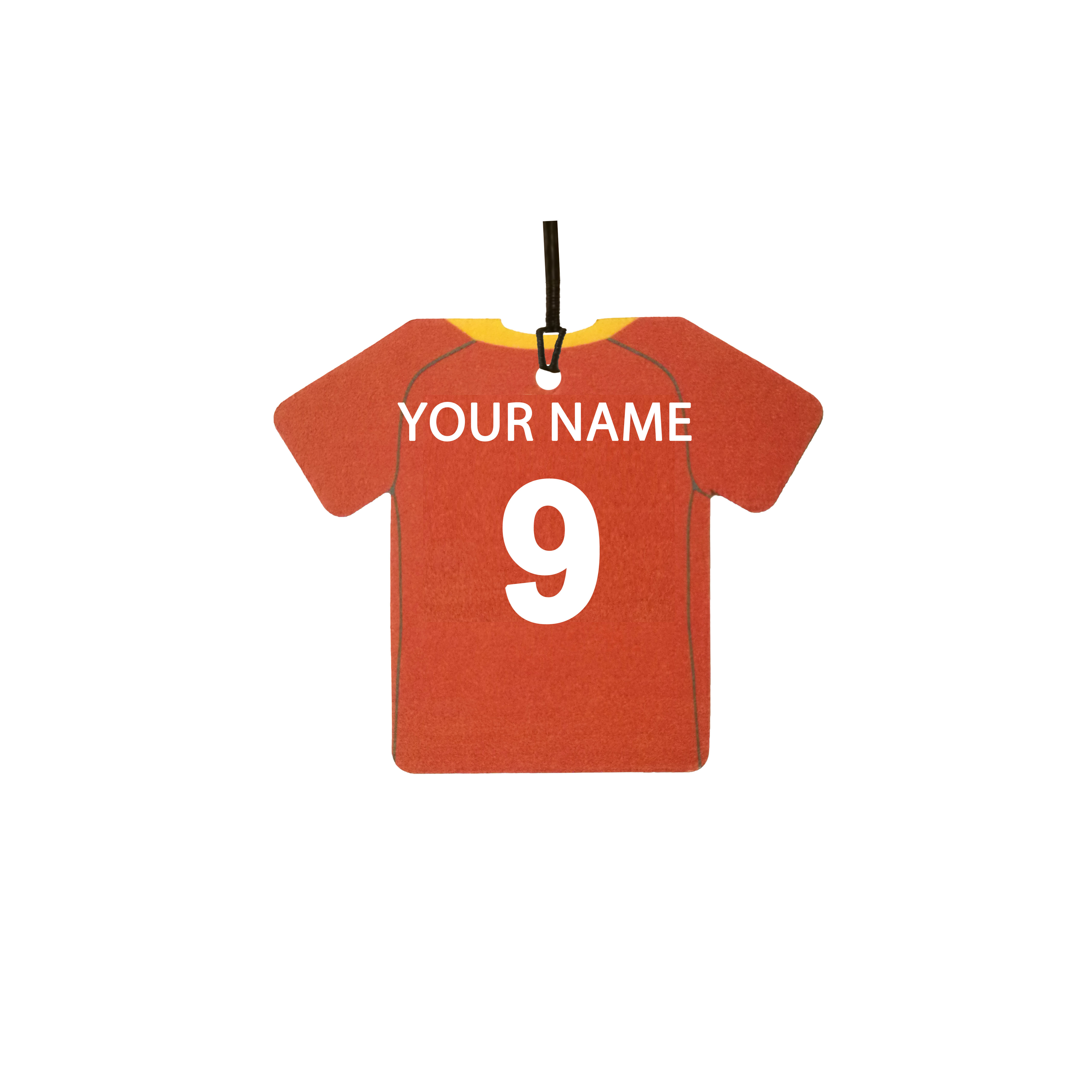 This is a personalised football shirt car air freshener. Ideal as a gift for any fan.