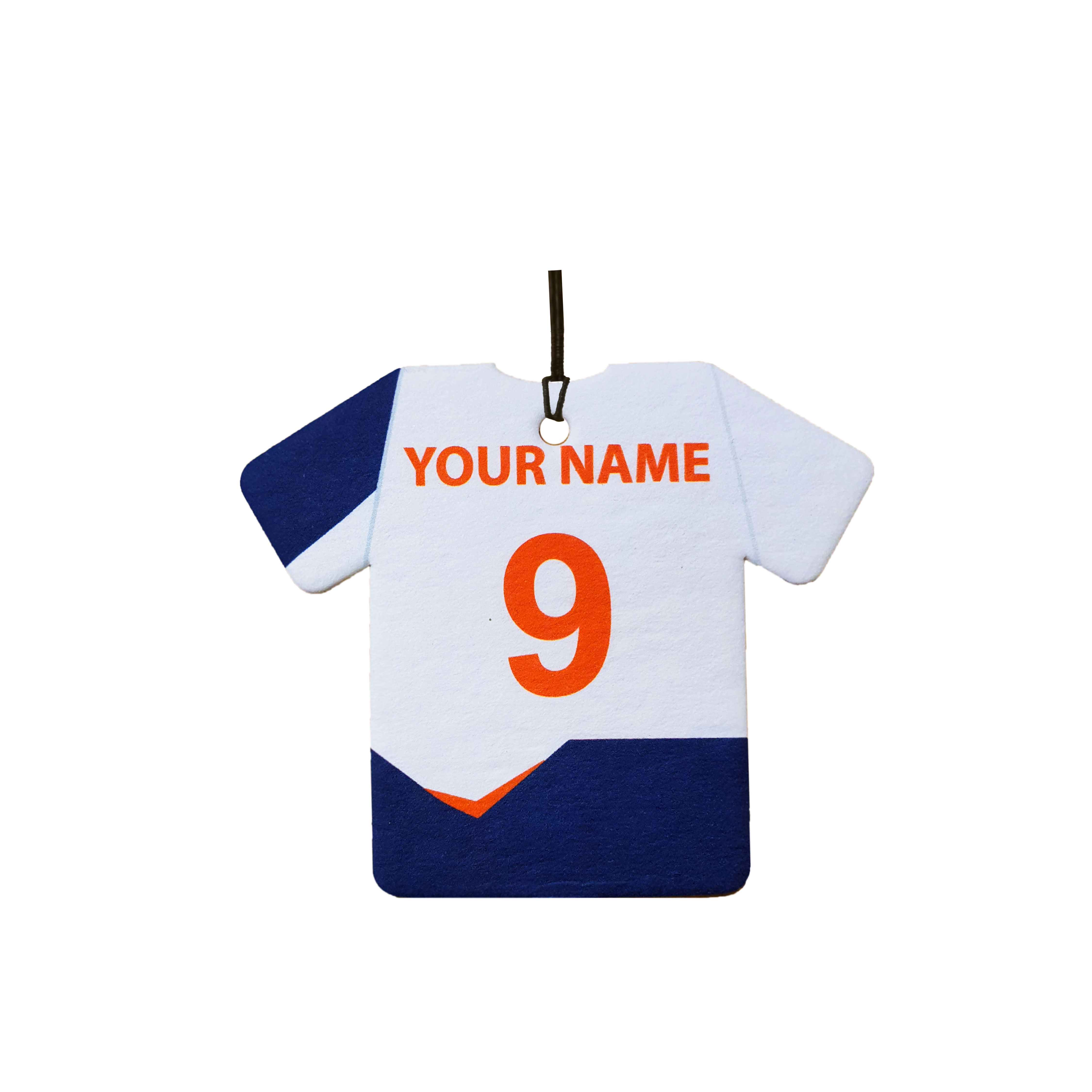 This is a personalised football shirt car air freshener. Ideal as a gift for any fan.