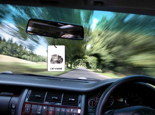 This air freshener is personalised with your cat’s name making it unique. The same image is printed both sides.