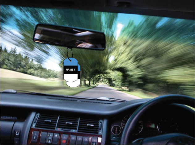 This novelty dog tag car air freshener is personalised with your name/s.
