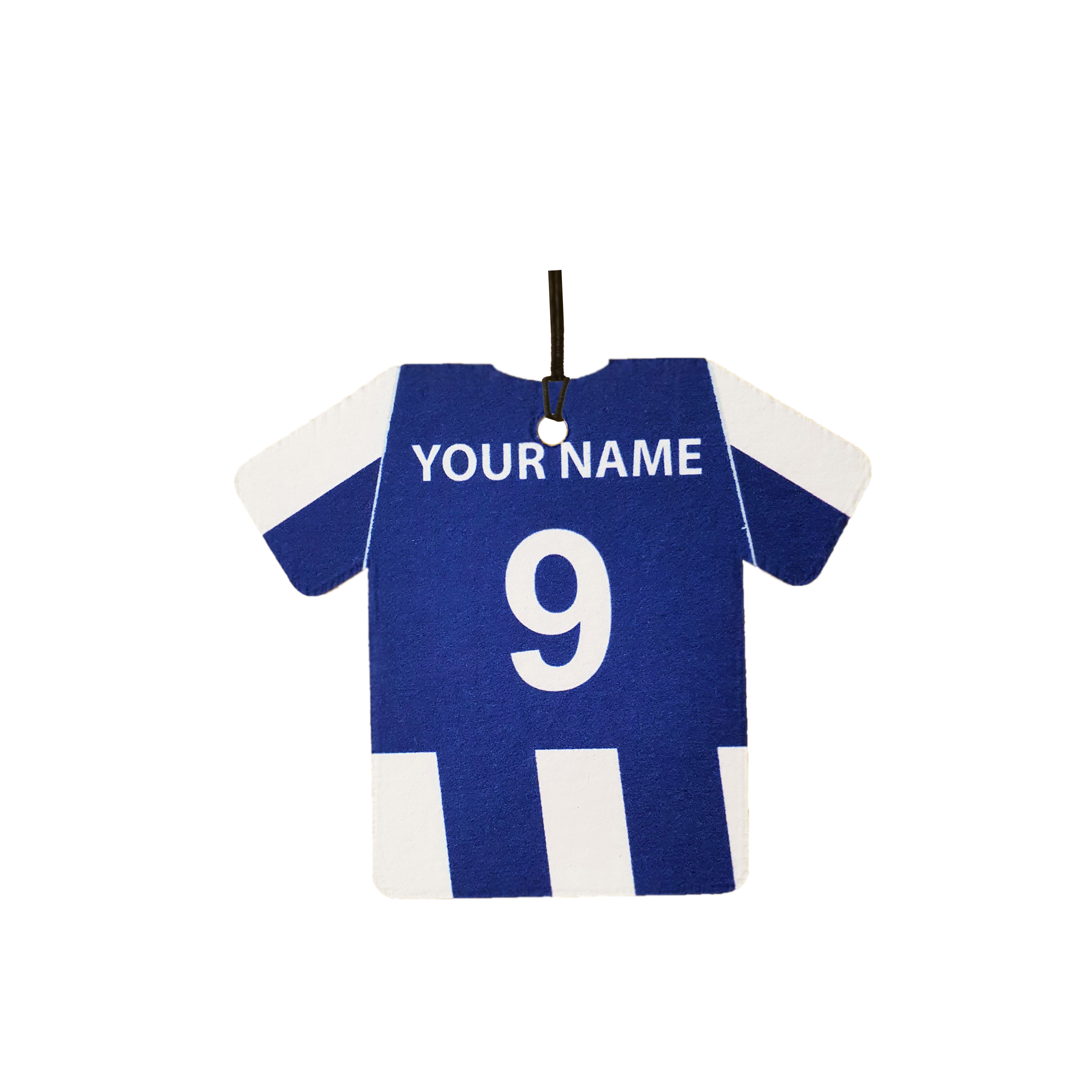 This is a personalised football shirt car air freshener. Ideal as a gift for any fan.