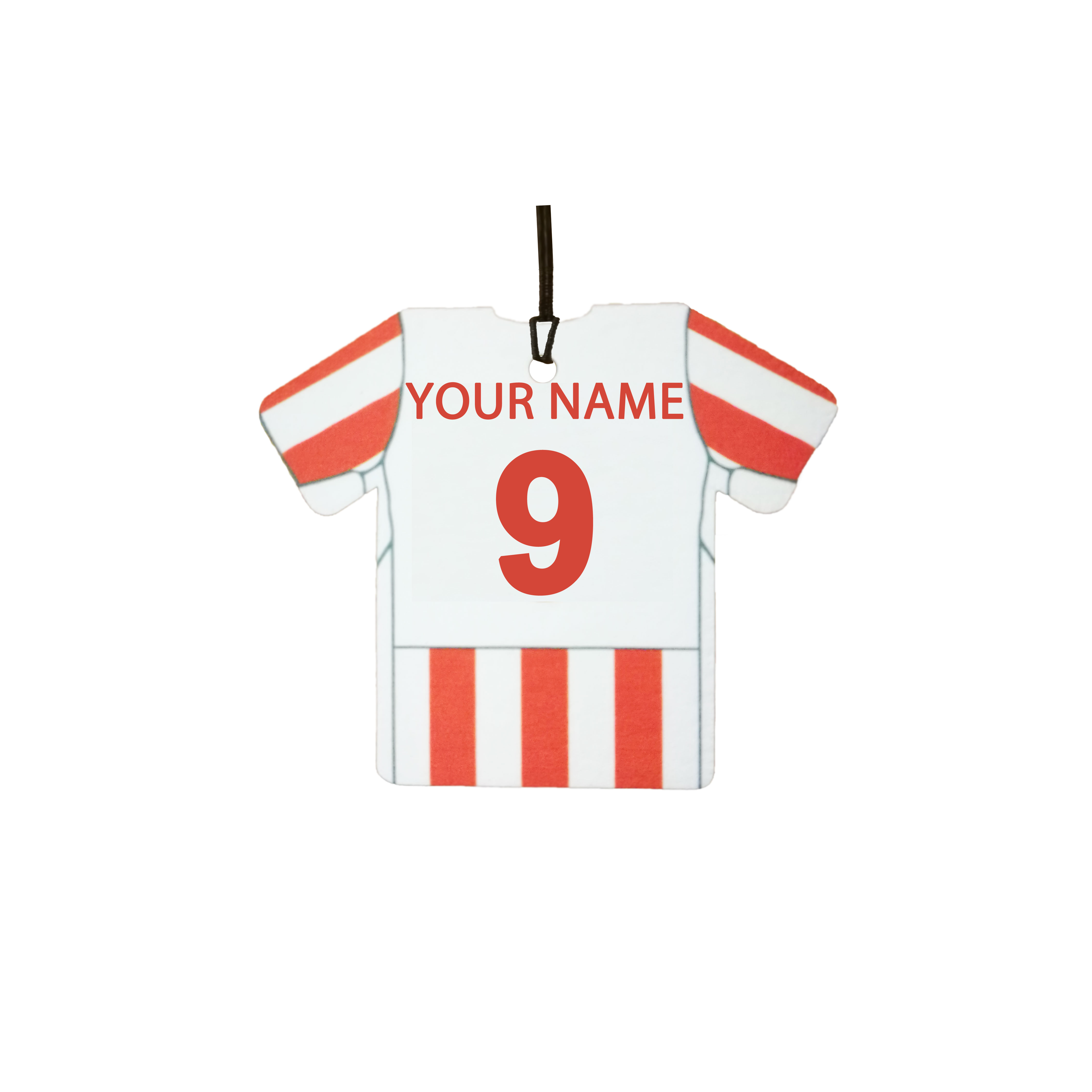 This is a personalised football shirt car air freshener. Ideal as a gift for any fan.