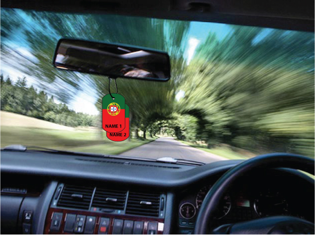 This novelty dog tag car air freshener is personalised with your name/s.