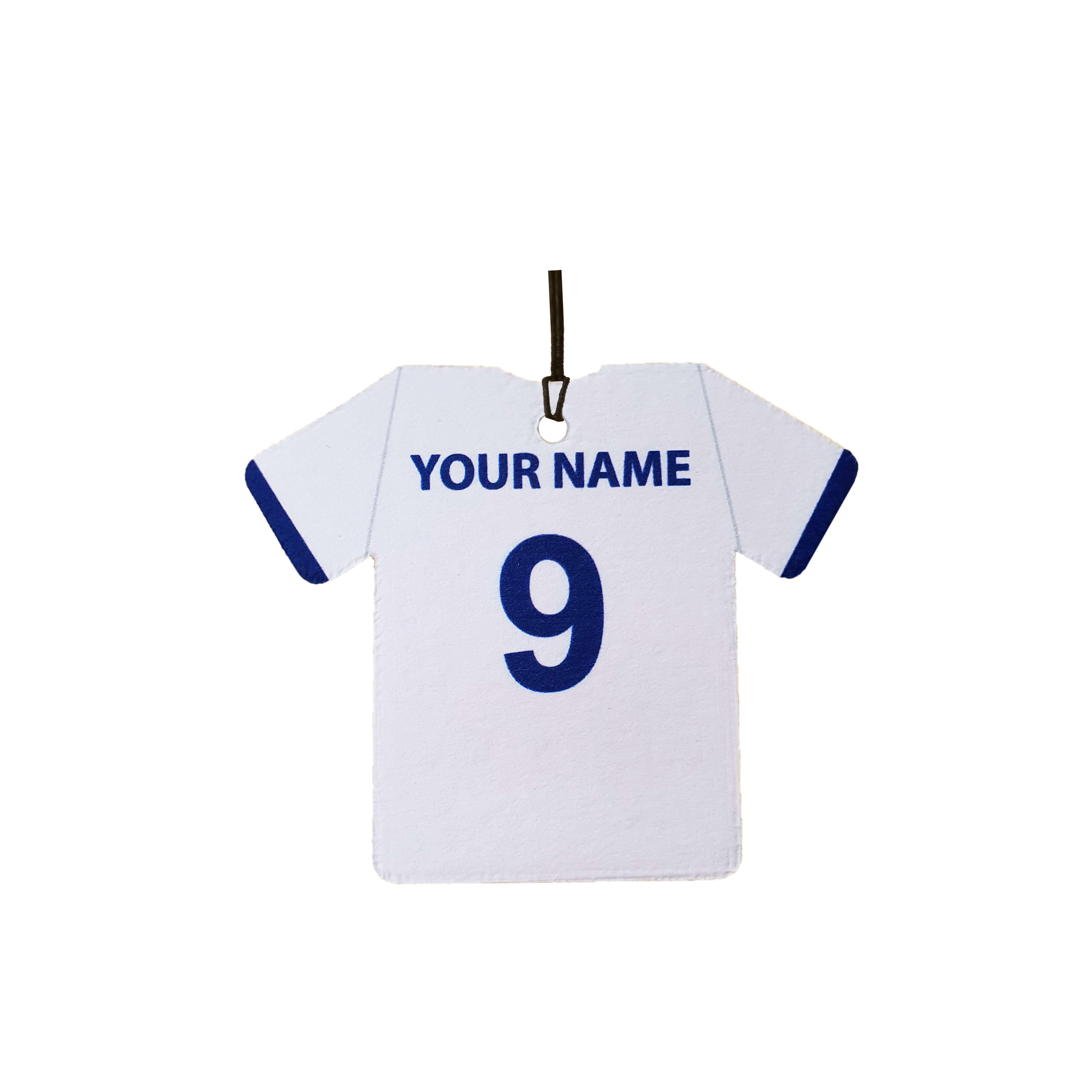 This is a personalised football shirt car air freshener. Ideal as a gift for any fan.