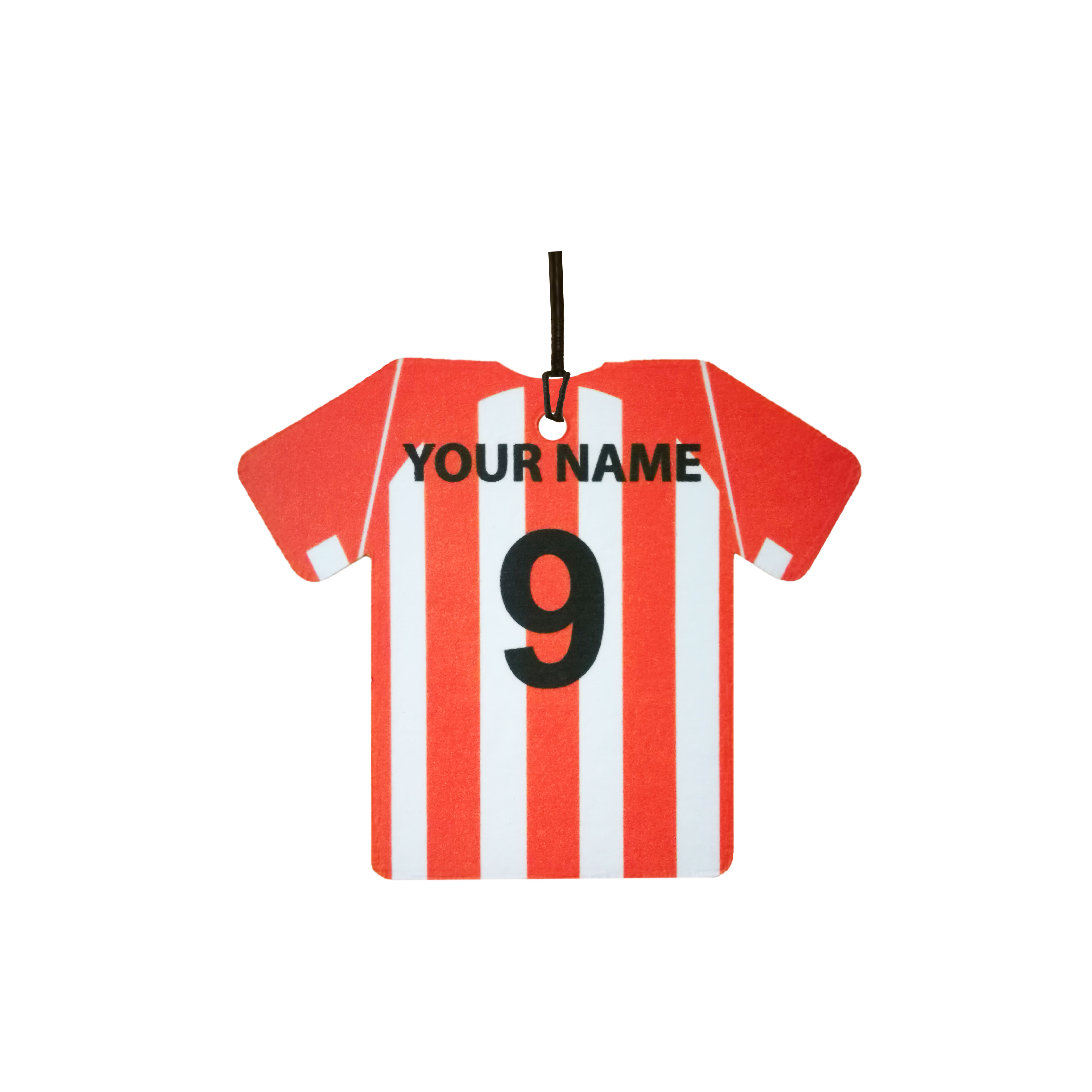 This is a personalised football shirt car air freshener. Ideal as a gift for any fan.