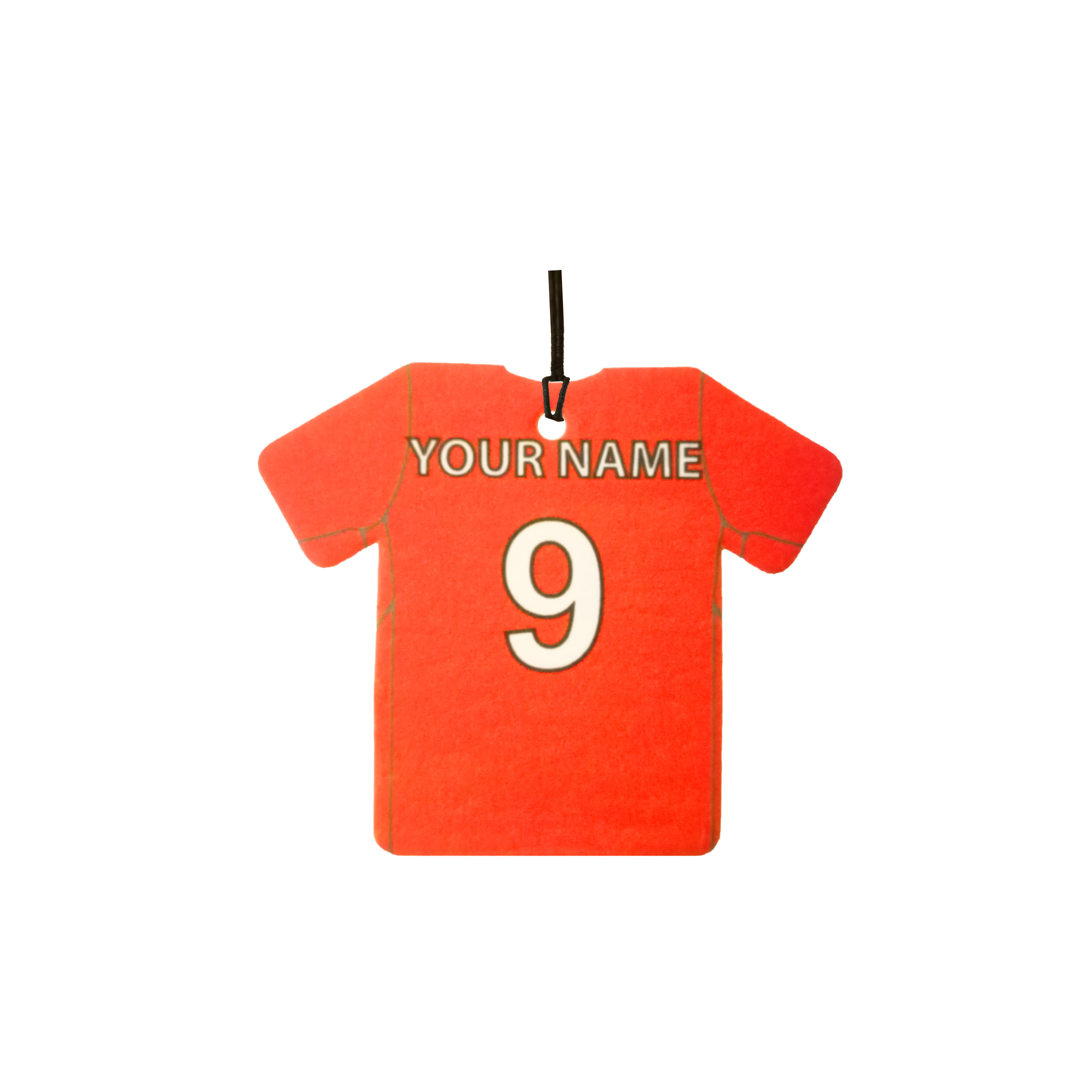 This is a personalised football shirt car air freshener. Ideal as a gift for any fan.