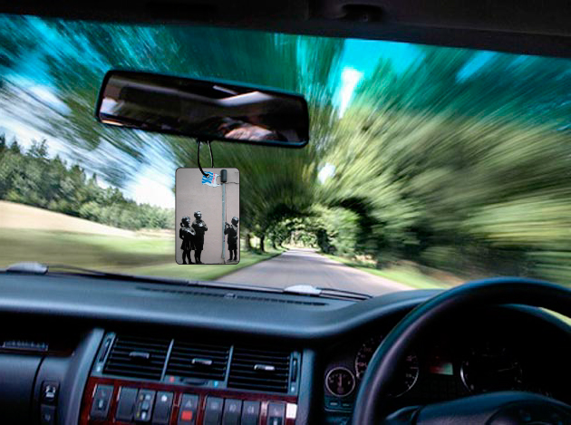 Car air freshener showcasing some of Banksy’s modern street art.